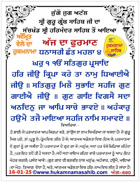 ਅੰਮ੍ਰਿਤ ਵੇਲੇ ਦਾ ਹੁਕਮਨਾਮਾ ਸ੍ਰੀ ਦਰਬਾਰ ਸਾਹਿਬ, ਅੰਮ੍ਰਿਤਸਰ, ਮਿਤੀ 16-01-2025 ਅੰਗ 690