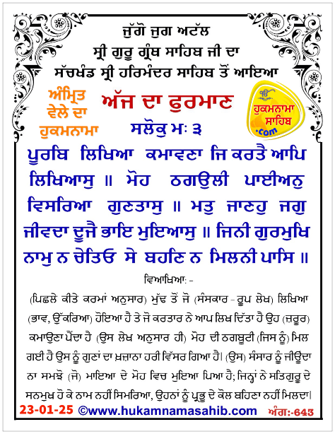 Amrit Wele Da Hukamnama Sachkhand Sri Harmandir Sahib Amritsar Ang 643, 23-01-2025