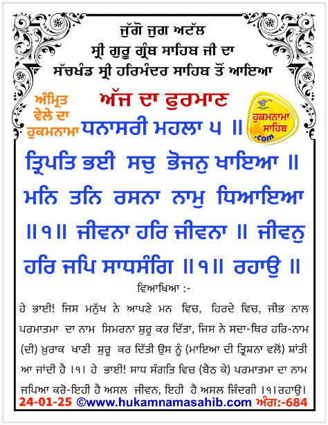 Amrit Wele Da Hukamnama Sachkhand Sri Harmandir Sahib Amritsar, Ang 684 : 24-01-2025