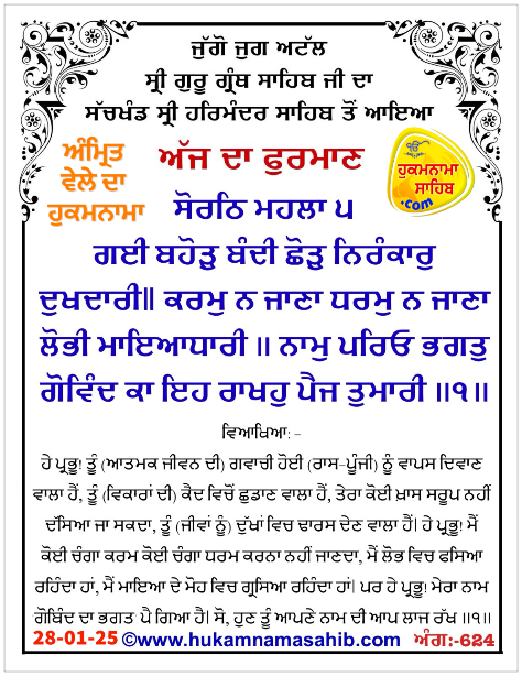 Amrit Vele da Hukamnama Shri Darbar Sahib Amritsar, Ang-624, 28-01–2025