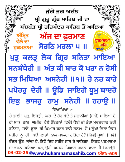 ਅੰਮ੍ਰਿਤ ਵੇਲੇ ਦਾ ਹੁਕਮਨਾਮਾ ਸ੍ਰੀ ਦਰਬਾਰ ਸਾਹਿਬ, ਅੰਮ੍ਰਿਤਸਰ, ਮਿਤੀ 04-02-2025 ਅੰਗ 609