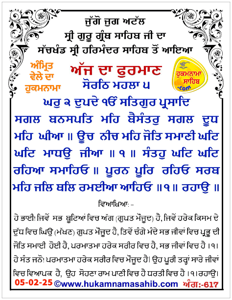 AMRIT VELE DA HUKAMNAMA SRI DARBAR SAHIB AMRITSAR, ANG 617, 05-02-2025