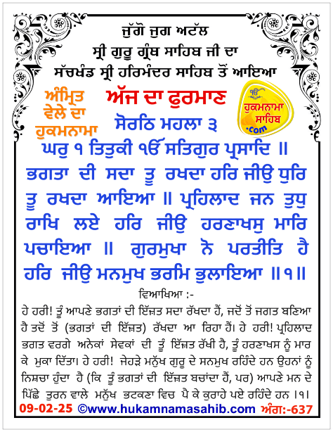 Amrit vele da Hukamnama Sri Darbar Sahib, Sri Amritsar, Ang 637, 09-02-2025