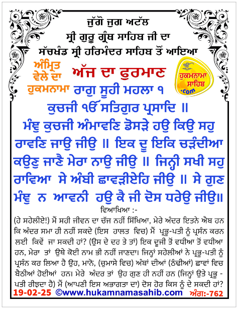 ਅੰਮ੍ਰਿਤ ਵੇਲੇ ਦਾ ਹੁਕਮਨਾਮਾ ਸ੍ਰੀ ਦਰਬਾਰ ਸਾਹਿਬ, ਅੰਮ੍ਰਿਤਸਰ, ਮਿਤੀ 19-02-2025 ਅੰਗ 762