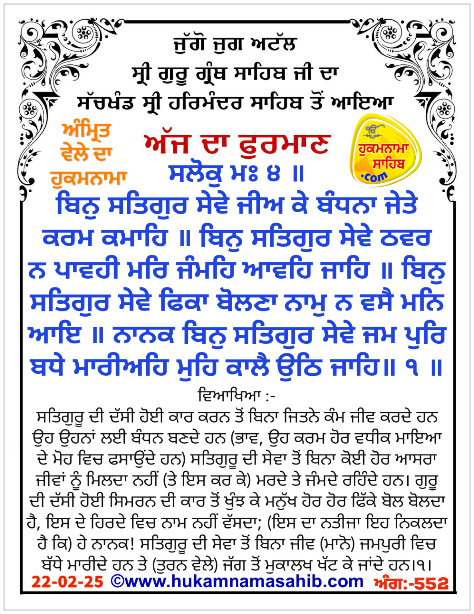 AMRIT VELE DA HUKAMNAMA SRI DARBAR SAHIB AMRITSAR, ANG 552, 22-02-2025