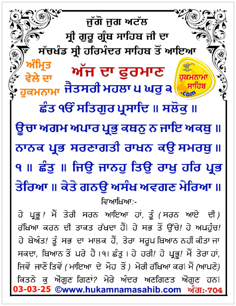 Amrit Vele da Hukamnama Sri Darbar Sahib Amritsar, Ang-704, 03-03-25