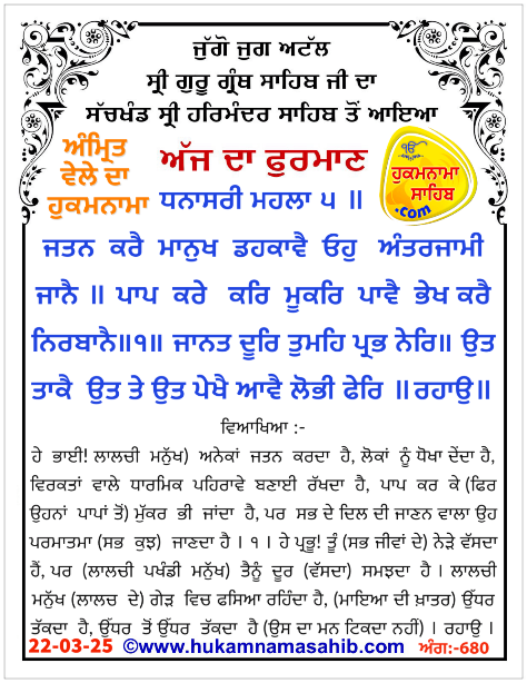 AMRIT VELE DA HUKAMNAMA SRI DRABAR SAHIB, AMRITSAR, ANG 680, 22-03-25