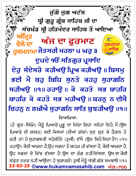 ਅੰਮ੍ਰਿਤ ਵੇਲੇ ਦਾ ਹੁਕਮਨਾਮਾ ਸ੍ਰੀ ਦਰਬਾਰ ਸਾਹਿਬ, ਅੰਮ੍ਰਿਤਸਰ, ਮਿਤੀ 23-03-2025 ਅੰਗ 700