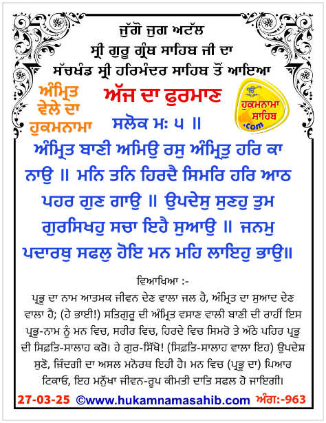 Amritvele da Hukamnama Sri Darbar Sahib, Sri Amritsar, Ang 963, 27-Mar-2025