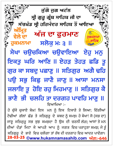 AMRIT VELE DA HUKAMNAMA SRI DARBAR SAHIB AMRITSAR, Ang 646, 28-03-2025