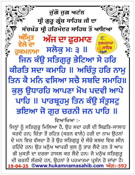 ਅੰਮ੍ਰਿਤ ਵੇਲੇ ਦਾ ਹੁਕਮਨਾਮਾ ਸ੍ਰੀ ਦਰਬਾਰ ਸਾਹਿਬ, ਅੰਮ੍ਰਿਤਸਰ, ਮਿਤੀ 19-04-2025 ਅੰਗ 592