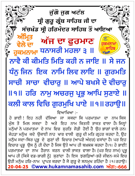 Amrit vele da Hukamnana, Sri Darbar Sahib, Sri Amritsar, Ang 666, 20-04-2025