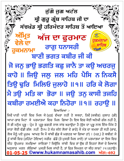 AMRIT VELE DA HUKAMNAMA SRI DARBAR SAHIB AMRITSAR, ANG 692, 01-05-2025
