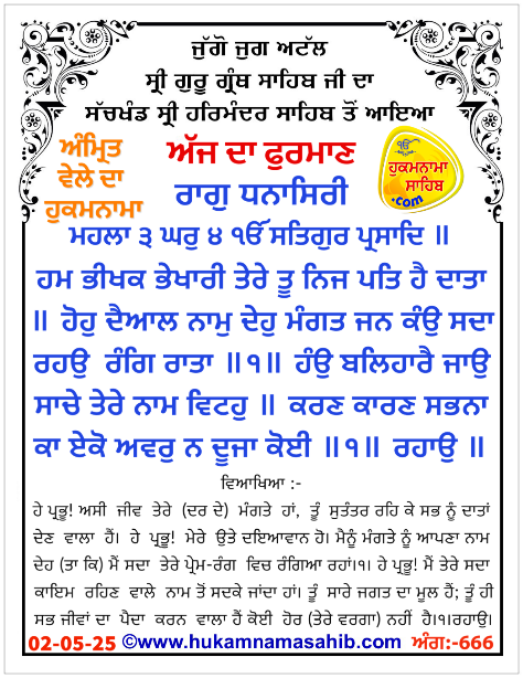 ਅੰਮ੍ਰਿਤ ਵੇਲੇ ਦਾ ਹੁਕਮਨਾਮਾ ਸ੍ਰੀ ਦਰਬਾਰ ਸਾਹਿਬ, ਅੰਮ੍ਰਿਤਸਰ, ਮਿਤੀ 02-05-2025 ਅੰਗ 666