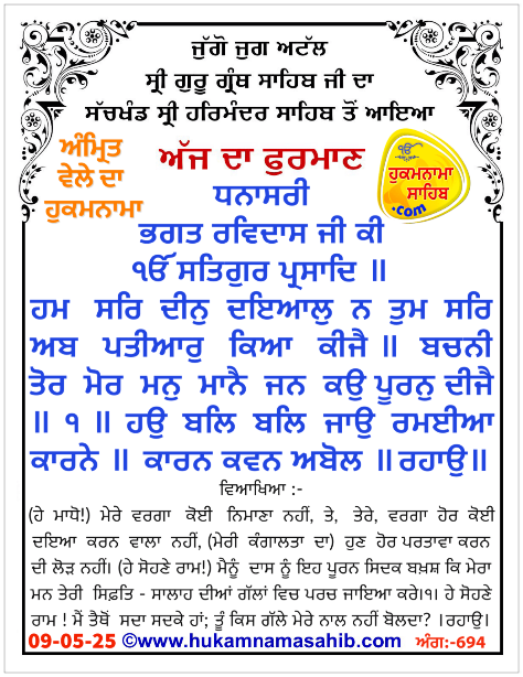 Amrit Vele da Hukamnama Sri Darbar Sahib, Sri Amritsar, Ang 694, 09-05-2025