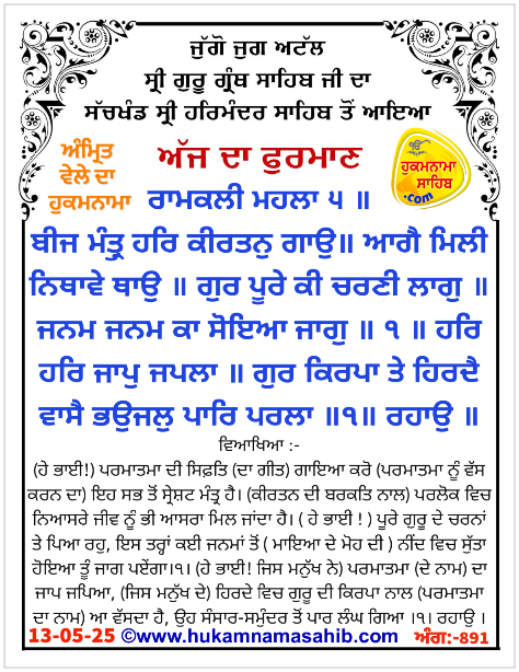 Amrit vele da Hukamnama Sri Darbar Sahib, Amritsar Sahib, Ang 891, 13-05-2025