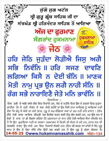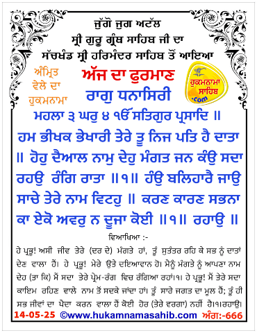 ਅੰਮ੍ਰਿਤ ਵੇਲੇ ਦਾ ਹੁਕਮਨਾਮਾ ਸ੍ਰੀ ਦਰਬਾਰ ਸਾਹਿਬ, ਅੰਮ੍ਰਿਤਸਰ, ਮਿਤੀ 14-05-2025 ਅੰਗ 666