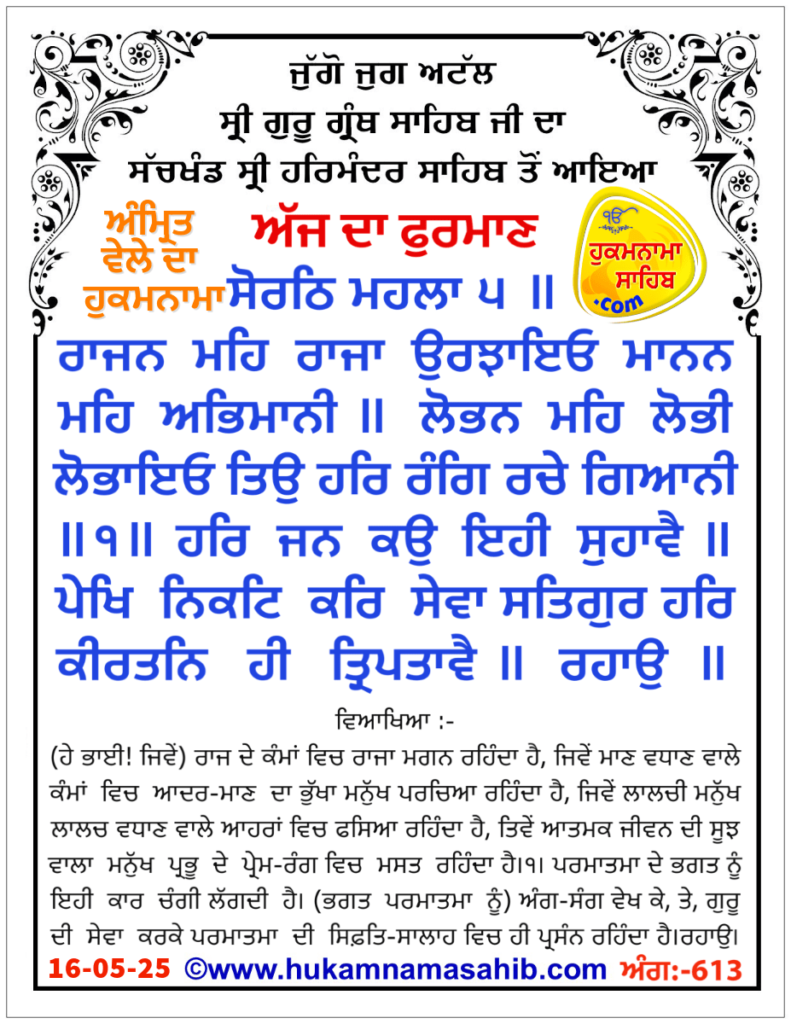 Amrit vele da Hukamnama Sri Darbar Sahib, Amritsar, Ang 613, 16-05-2025