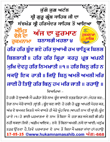 ਅੰਮ੍ਰਿਤ ਵੇਲੇ ਦਾ ਹੁਕਮਨਾਮਾ ਸ੍ਰੀ ਦਰਬਾਰ ਸਾਹਿਬ, ਅੰਮ੍ਰਿਤਸਰ, ਮਿਤੀ 17-05-2025 ਅੰਗ 668