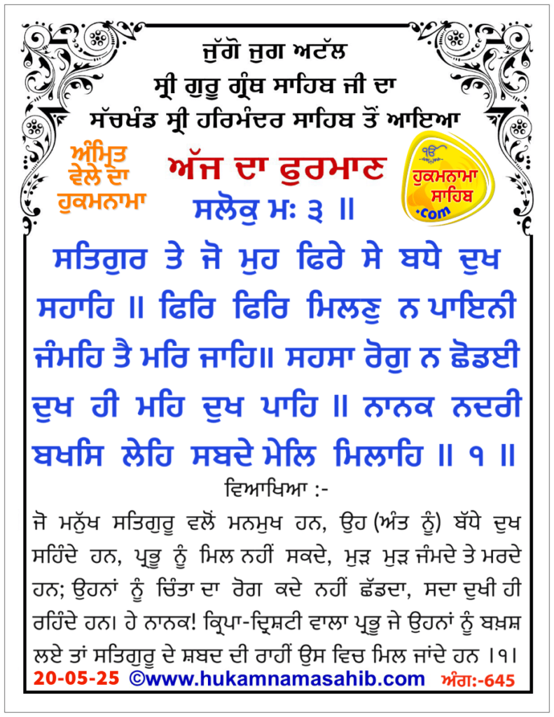 AMRIT VELE DA HUKAMNAMA SRI DARBAR SAHIB AMRITSAR, ANG 645, 20-05-25