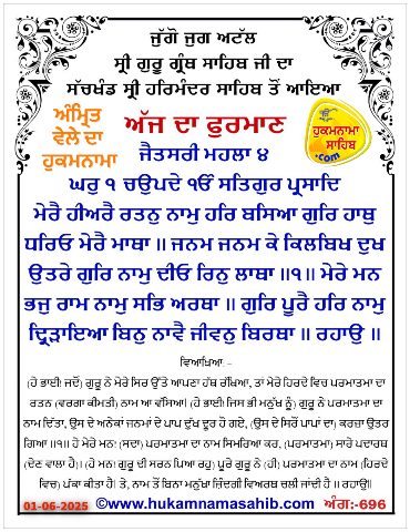 ਅੰਮ੍ਰਿਤ ਵੇਲੇ ਦਾ ਹੁਕਮਨਾਮਾ ਸ੍ਰੀ ਦਰਬਾਰ ਸਾਹਿਬ, ਅੰਮ੍ਰਿਤਸਰ, ਮਿਤੀ 01-06-2025 – Punjabi Dunia