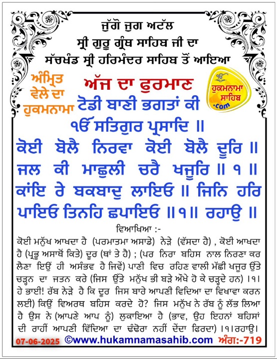 AMRIT VELE DA HUKAMNAMA SRI DARBAR SAHIB AMRITSAR, ANG 718, 07-06-2025
