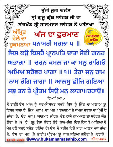 AMRIT VELE DA HUKAMNAMA SRI DARBAR SAHIB AMRITSAR, ANG 682, 13-06-2025