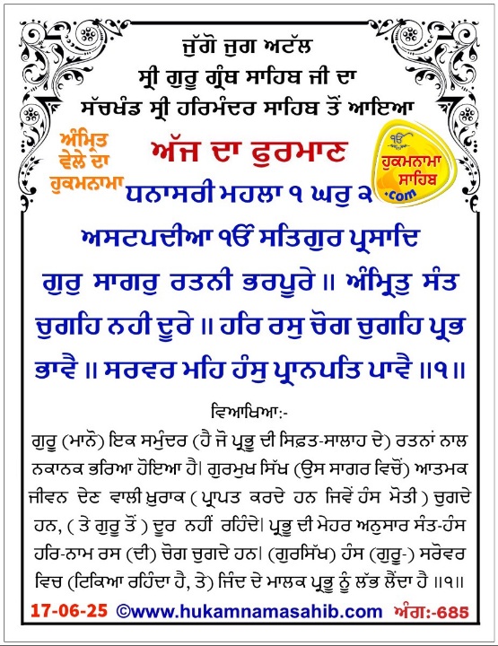 Amrit Wele da Mukhwak Sachkhand Shri Harmandar Sahib Amritsar, Ang-685, 17-06-2025