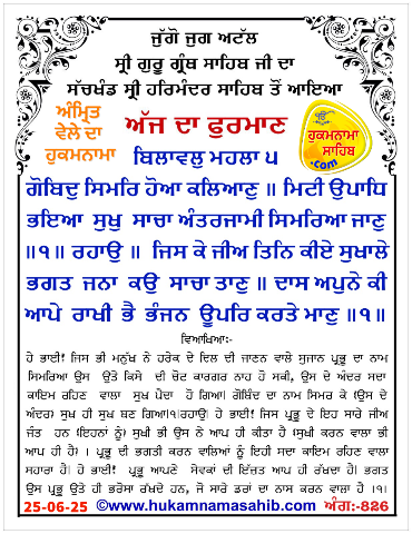 Amrit vele da Hukamnama Sri Darbar Sahib, Amritsar Sahib, Ang 826, 25-06-2025