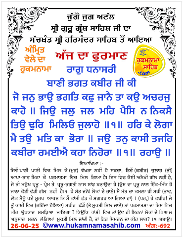 AMRIT VELE DA HUKAMNAMA SRI DARBAR SAHIB AMRITSAR, ANG 692, 26-06-2025