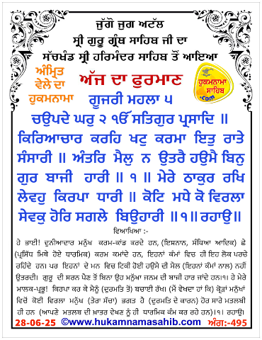 AMRIT VELE DA HUKAMNAMA SRI DARBAR SAHIB, AMRITSAR, ANG 495, 29-06-2025
