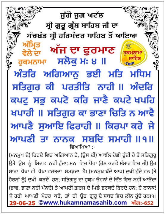Amrit Vele da Hukamnama Sachkhand Sri Harmandir Sahib Amritsar Ang 652 Date 29-06-25