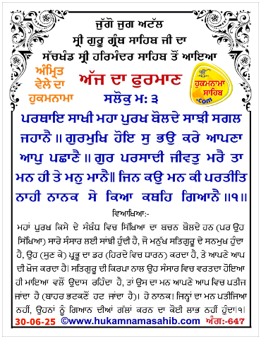 AMRIT VELE DA HUKAMNAMA SRI DARBAR SAHIB, SRI AMRITSAR, ANG 647, 30-06-2025