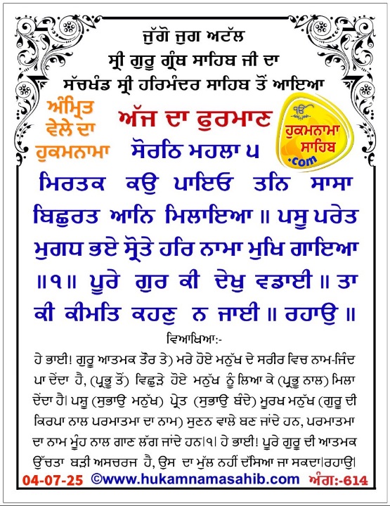 English Translation: SORAT’H, FIFTH MEHL:He infuses the breath into the dead bodies, and he reunited the separated ones. Even beasts, demons and fools become attentive listeners, when He sings the Praises of the Lord’s Name. || 1 || Behold the glorious greatness of the Perfect Guru. His worth cannot be described. || Pause || He has demolished the abode of sorrow and disease, and brought bliss, joy and happiness. He effortlessly awards the fruits of the mind’s desire, and all works are brought to perfection. || 2 || He finds peace in this world, and his face is radiant in the world hereafter; his comings and goings are finished. He becomes fearless, and his heart is filled with the Naam, the Name of the Lord; his mind is pleasing to the True Guru. || 3 || Standing up and sitting down, he sings the Glorious Praises of the Lord; his pain, sorrow and doubt are dispelled. Says Nanak, his karma is perfect; his mind is attached to the Guru’s feet. || 4 || 10 || 21 ||