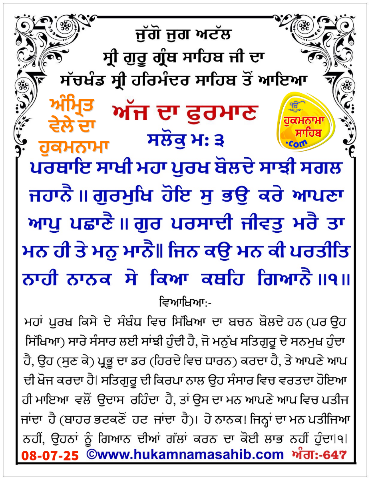 AMRIT VELE DA HUKAMNAMA SRI DARBAR SAHIB, SRI AMRITSAR, ANG 647, 08-07-2025