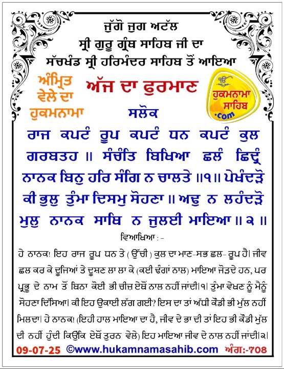 Amrit Vele Da Hukamnama Sachkhand Sri Darbar Sahib, Amritsar, Ang 708 Date 09-07-2025