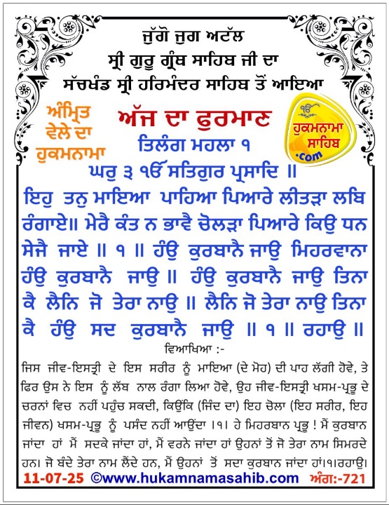 Amrit Vele da Hukamnama Sachkhand Sri Darbar Sahib Amritsar, Ang 721, Date:11-07-25