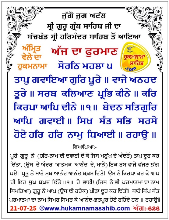 Amrit vele da Hukamnama Sri Darbar Sahib Sri Amritsar, Ang 626, 21-07-25
