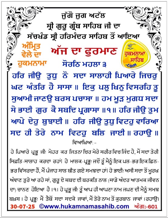 Amrit vele da Hukamnama Sri Darbar Sahib, Sri Amritsar, Ang 601, 30-07-2025