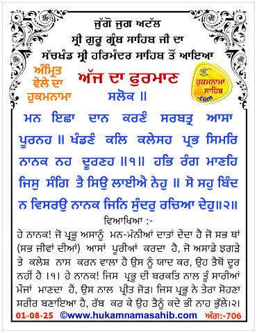Sachkhand Sri Harmandir Sahib Amritsar Vekhe Hoea Amrit Wele Da Mukhwak, Ang 706 : 01-08-2025