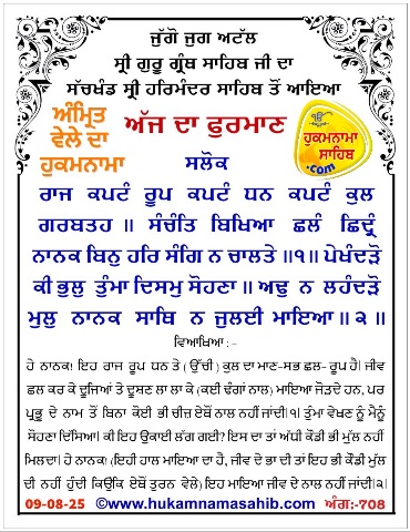 Amrit Vele Da Hukamnama Sachkhand Sri Darbar Sahib, Amritsar, Ang 708 Date 09-08-2025
