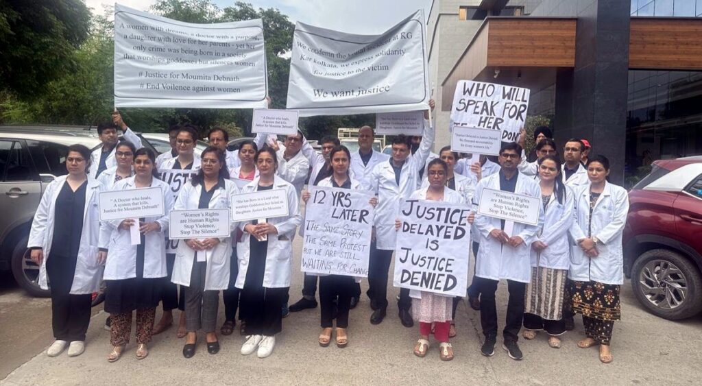 ਰੋਸ ਵਜੋਂ ਨਾਅਰੇਬਾਜ਼ੀ ਕਰਦੇ ਹੋਏ ਡਾਕਟਰਾਂ ਨੇ ਕੋਲਕਾਤਾ ਦੇ ਆਰਜੀ ਕਾਰ ਮੈਡੀਕਲ ਕਾਲਜ ਅਤੇ ਹਸਪਤਾਲ ਵਿੱਚ 31 ਸਾਲਾ ਸਿਖਿਆਰਥੀ ਡਾਕਟਰ ਨਾਲ ਬਲਾਤਕਾਰ ਅਤੇ ਹੱਤਿਆ ਦੀ ਨਿੰਦਾ ਕੀਤੀ।