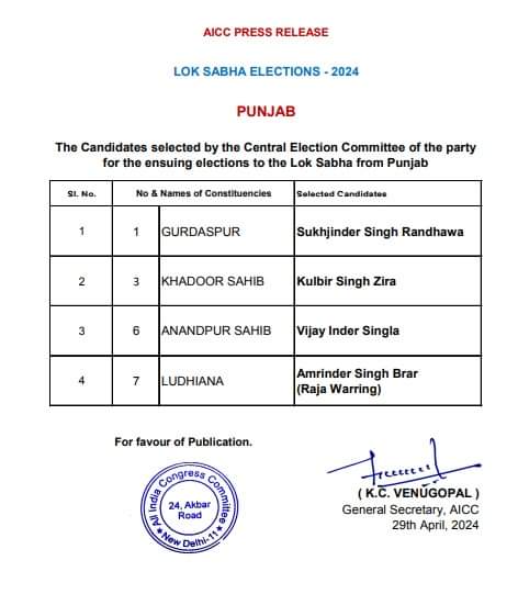 ਕਾਂਗਰਸ ਵਲੋਂ ਪੰਜਾਬ ‘ਚ 4 ਉਮੀਦਵਾਰਾਂ ਦਾ ਐਲਾਨ, ਰਾਜਾ ਵੜਿੰਗ ਲੁਧਿਆਣਾ ਤੋਂ ਲੜਨਗੇ ਚੋਣ
