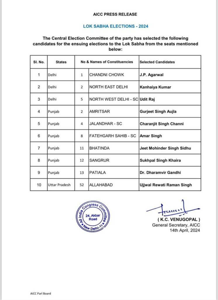 ਅੱਜ ਕਾਂਗਰਸ ਪਾਰਟੀ ਵੱਲੋਂ ਲੋਕ ਸਭਾ ਲਈ 10 ਉਮੀਦਵਾਰਾਂ ਦੀ ਨਵੀਂ ਸੂਚੀ ਜਾਰੀ ਕੀਤੀ ਗਈ ਹੈ। ਜਿਸ ਵਿੱਚ ਪੰਜਾਬ ਵਿੱਚ ਅੰਮ੍ਰਿਤਸਰ ਤੋਂ ਗੁਰਜੀਤ ਔਜਲਾ, ਪਟਿਆਲਾ ਤੋਂ ਧਰਮਵੀਰ ਗਾਂਧੀ, ਫਤਹਿਗੜ੍ਹ ਸਾਹਿਬ ਤੋਂ ਅਮਰ ਸਿੰਘ, ਬਠਿੰਡਾ ਤੋਂ ਜੀਤ ਮਹਿੰਦਰ ਸਿੰਘ ਸਿੱਧੂ, ਜਲੰਧਰ ਤੋਂ ਸਾਬਕਾ ਮੁੱਖ ਮੰਤਰੀ ਚਰਨਜੀਤ ਸਿੰਘ ਚੰਨੀ ਜਦਕਿ ਸੰਗਰੂਰ ਸੀਟ ਤੋਂ ਸੁਖਪਾਲ ਸਿੰਘ ਖਹਿਰਾ ਨੂੰ ਉਮੀਦਵਾਰ ਬਣਾਇਆ ਗਿਆ ਹੈ। ਇਸ ਤੋਂ ਇਲਾਵਾ ਦਿੱਲੀ ਤੋਂ 3 ਅਤੇ ਯੂਪੀ ਦੇ ਇਲਾਹਾਬਾਦ ਤੋਂ ਉਜਵਲ ਰੇਵਤੀ ਰਮਨ ਸਿੰਘ ਨੂੰ ਉਮੀਦਵਾਰਾਂ ਐਲਾਨ ਕੀਤਾ ਗਿਆ ਹੈ।